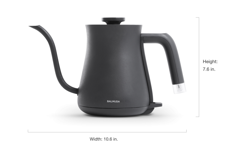 BALMUDA The Kettle is a minimalist design piece with a precision pouring spout — compact 0.6 L capacity and 1200 W rated power consumption.