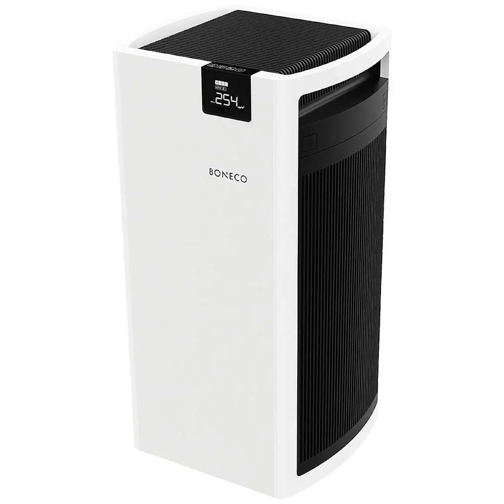 The Boneco P710 is one of the most powerful air purifiers on the market, designed for highly polluted environments and large rooms up to 72 m². With a dual filtration system (HEPA + activated carbon), it effectively removes fine dust, allergens, gases, odors, smoke, bacteria, and pet dander. Delivering an airflow of up to 800 m³/h, the unit ensures fast and efficient air cleaning. A built-in laser particle sensor continuously monitors air quality and adjusts the purification level automatically via Auto Mode. The device features a child lock, timer function, filter replacement reminder, and easy mobility with handles and transport wheels. Despite its power, it runs quietly from 37 to 66 dB and consumes only 67W.