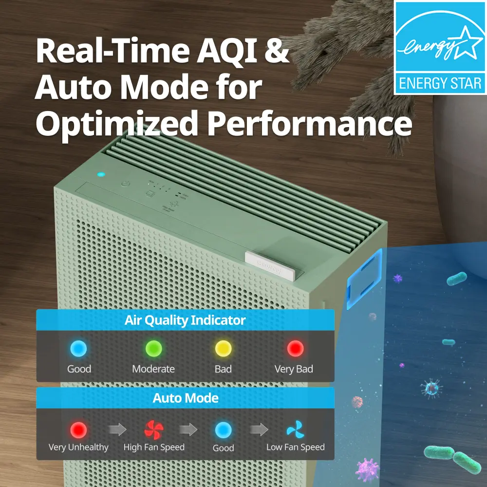 Compact and whisper-quiet air purifier with triple filtration system, removes up to 99.999% of particles down to 0.01 µm, ideal for allergy sufferers and rooms up to 73 m².