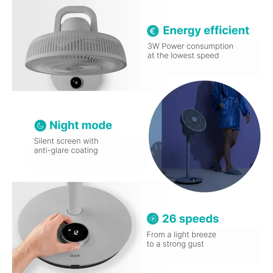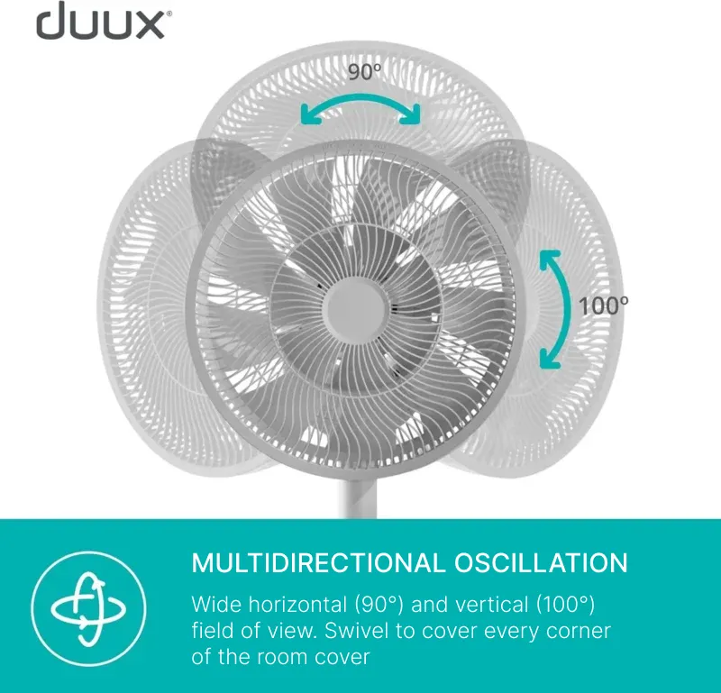 - App Connectivity (With Optional Battery Pack): Control the fan via smartphone using the Duux Smart App. Set timers, adjust airflow, and manage from anywhere.