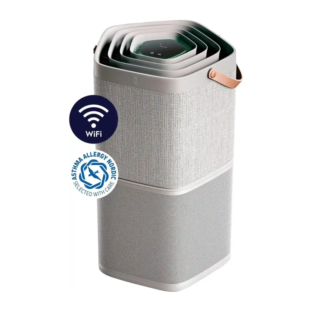 The Electrolux Pure A9 PA91-404GY is a high-performance, connected air purifier designed for large rooms up to 92 m². It features a 5-stage filtration system: mesh pre-filter, antibacterial layer, fine particle filter, activated carbon filter, and an ionizer — capable of filtering 99.5% of particles down to 0.1 µm and reducing 97% of VOCs and odors. The 360° AirSurround system ensures even air circulation, while the PureSense sensor continuously monitors and adjusts purification based on indoor air quality. The device is controlled via a touch panel or the Wellbeing mobile app (iOS/Android), which also tracks real-time air quality and filter status (via RFID chip). Certified by ECARF and Asthma Allergy Nordic, it is exceptionally quiet (17 dB in silent mode) and energy-efficient. The elegant Scandinavian design complements any modern interior.