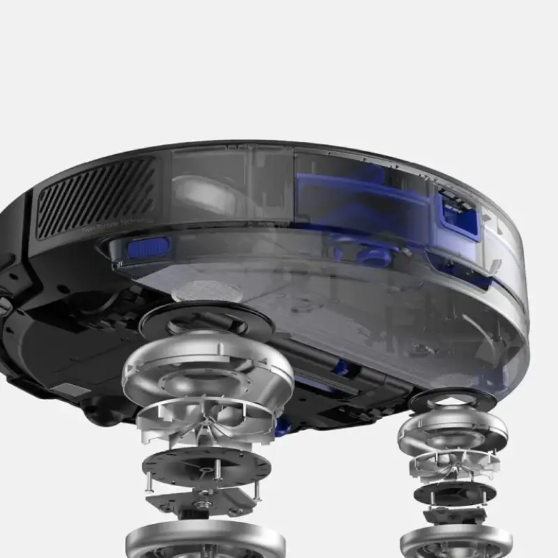 Hybrid vacuum and mop with twin turbines for 4000Pa suction total. Optimized for pets, carpets, and hardwood surfaces.