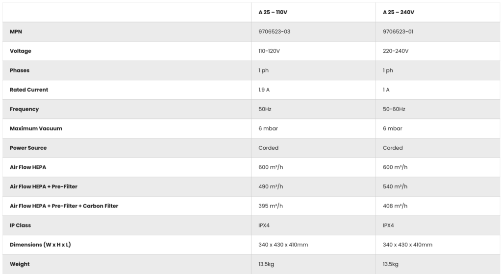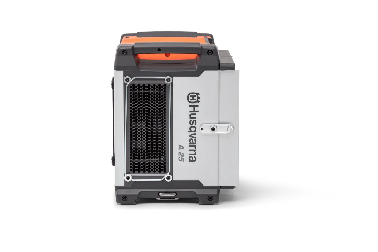 The smart and robust design of the Husqvarna A25 allows easy access for service and maintenance, as well as easy filter changes and decontamination thanks to its IP54 water-protected classification that enables it to be easily cleaned down using a hosepipe and water (with filters removed first before washing down)