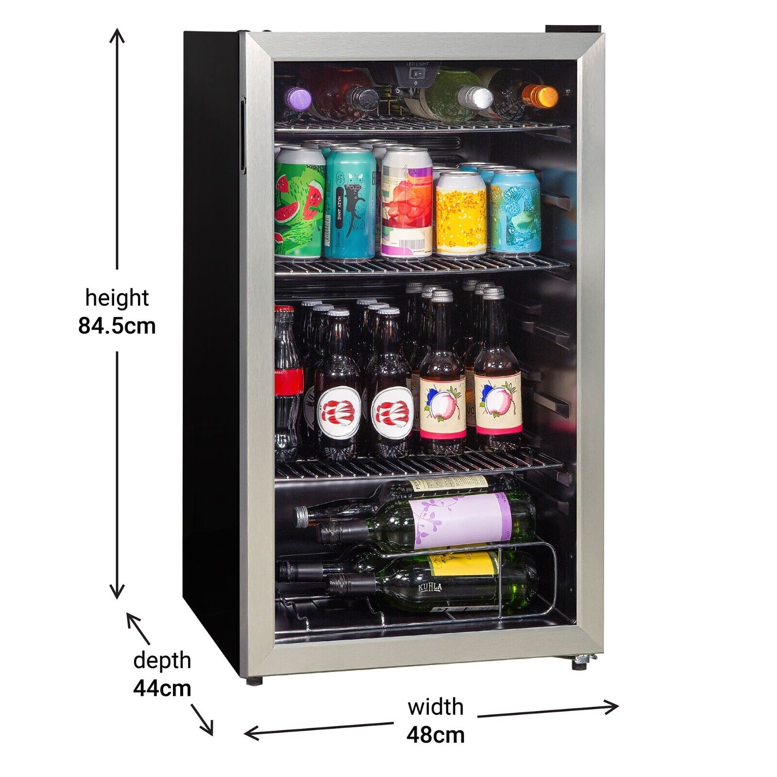 Kuhla K48BC101SS stainless steel beverage cooler for 48 cans (93 L) — single zone, 2–18°C, glass door, LED lighting, freestanding.