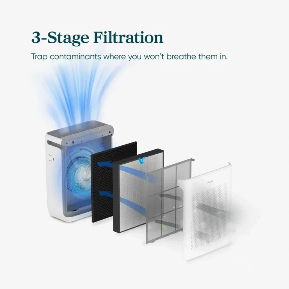 The LEVOIT Vital 200S is a smart, high-efficiency air purifier ideal for allergy sufferers and pet owners. It offers a CADR of 416 m³/h and purifies rooms up to 87 m² twice per hour. Featuring a 3-stage filtration system—washable pre-filter, H13 True HEPA filter, and high-efficiency activated carbon—it captures 99.97% of particles down to 0.3 microns and neutralizes pet odors and VOCs. The dual sensor system detects real-time air quality and adjusts fan speed accordingly. Special Pet Mode removes hair and dander effectively without clogging the filters. It supports voice commands via Alexa and Google Assistant and full control through the VeSync app. With a light sensor, ultra-quiet 24 dB Sleep Mode, filter life tracking, and programmable timers, the Vital 200S is powerful, versatile, and built for modern homes.