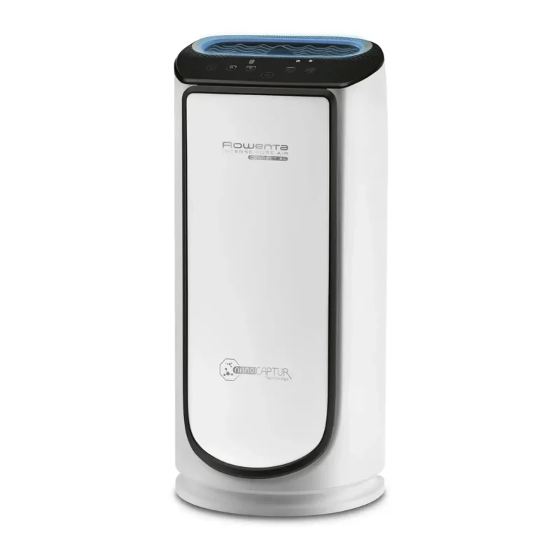 The Rowenta Intense Pure Air Connect XL (PU6080) is a powerful and ultra-quiet air purifier designed for large spaces up to 140 m². With a 4-level filtration system — pre-filter, activated carbon, Allergy+, and NanoCaptur+ — it captures up to 100% of allergens and fine particles, including formaldehyde. Features include touch control, Wi-Fi connectivity, air quality sensors, automatic and manual modes, and compatibility with the Pure Air mobile app for real-time control and monitoring. The purifier operates quietly at just 17.5 dB in silent mode and includes a timer, boost and night modes, and filter change indicator.