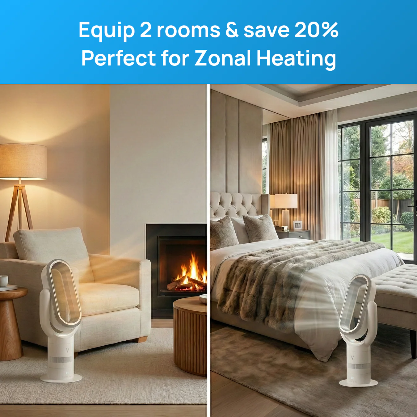- Cooling mode (40W) — refreshing bladeless breeze in summer at just 1p/hr